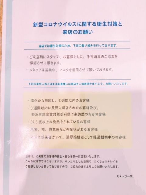 現在当店ではお客様の安全を考慮しまして大変恐縮ですが、